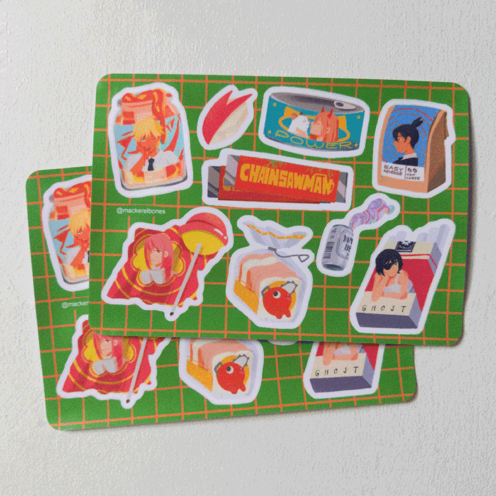 A collection of merchandise designs ranging from, acrylic charms, wooden charms, lanyards, stickers, etc... for online and convention sales.